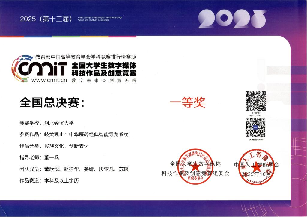 全国大学生数字媒体科技作品及创意竞赛是由中国人工智能学会主办的全国性高水平学科竞赛,创办于2013年,旨在推动智能科技与数字创意的融合,提升大学生创新实践能力。本次全国总决赛在哈尔滨举行。我院代表队携作品《岐黄纪年:中华医药经典智能导览系统》参赛,参与“民族文化,创新表达”类别全国总决赛的角逐。经过现场答辩、专家评审、作品复议等环节的激烈争夺,我院作品最终取得了国赛一等奖的优异成绩。