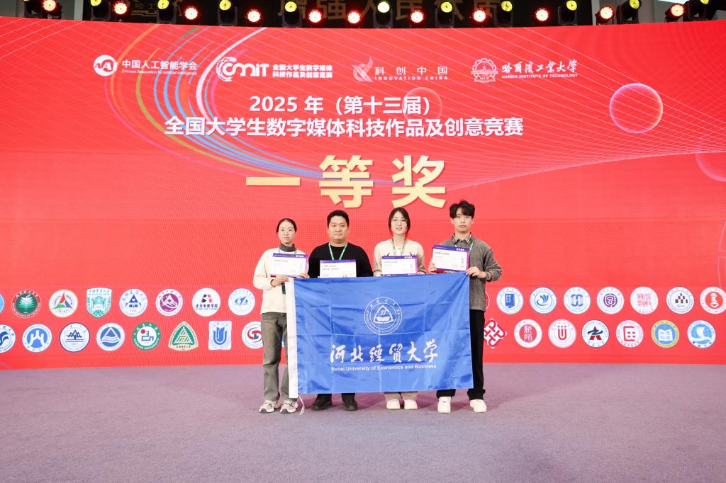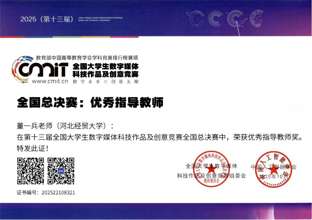日前,我院学生董欣悦、赵建华、姜婧,段亚凡(研究生)、苏琛(研究生)及指导教师董一兵组成的参赛队伍,在2025年第十三届全国大学生数字媒体科技作品及创意竞赛全国总决赛中荣获一等奖,指导教师董一兵荣获“优秀指导教师”称号。