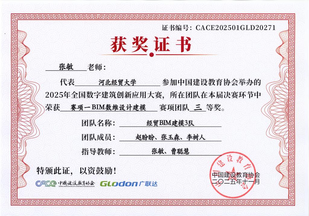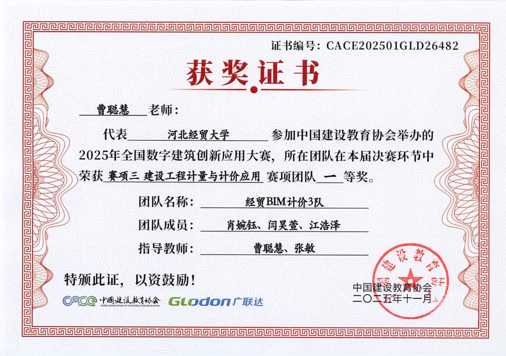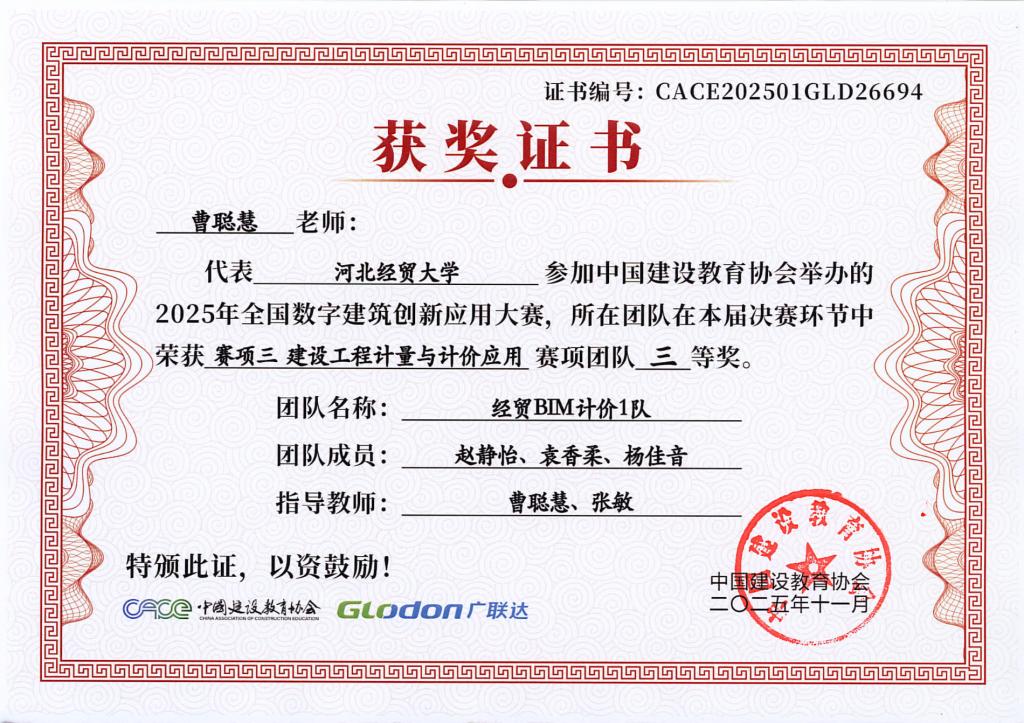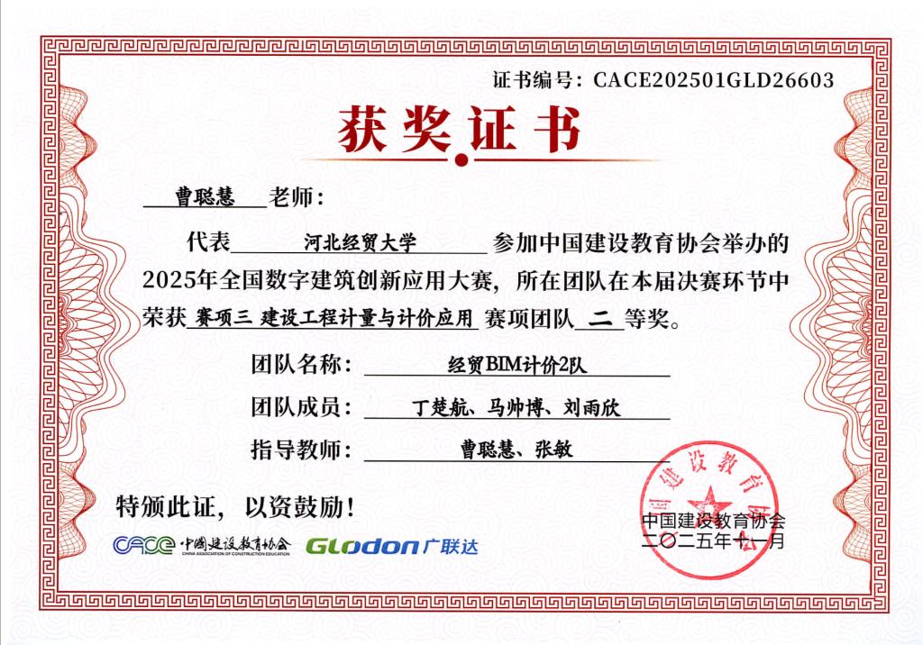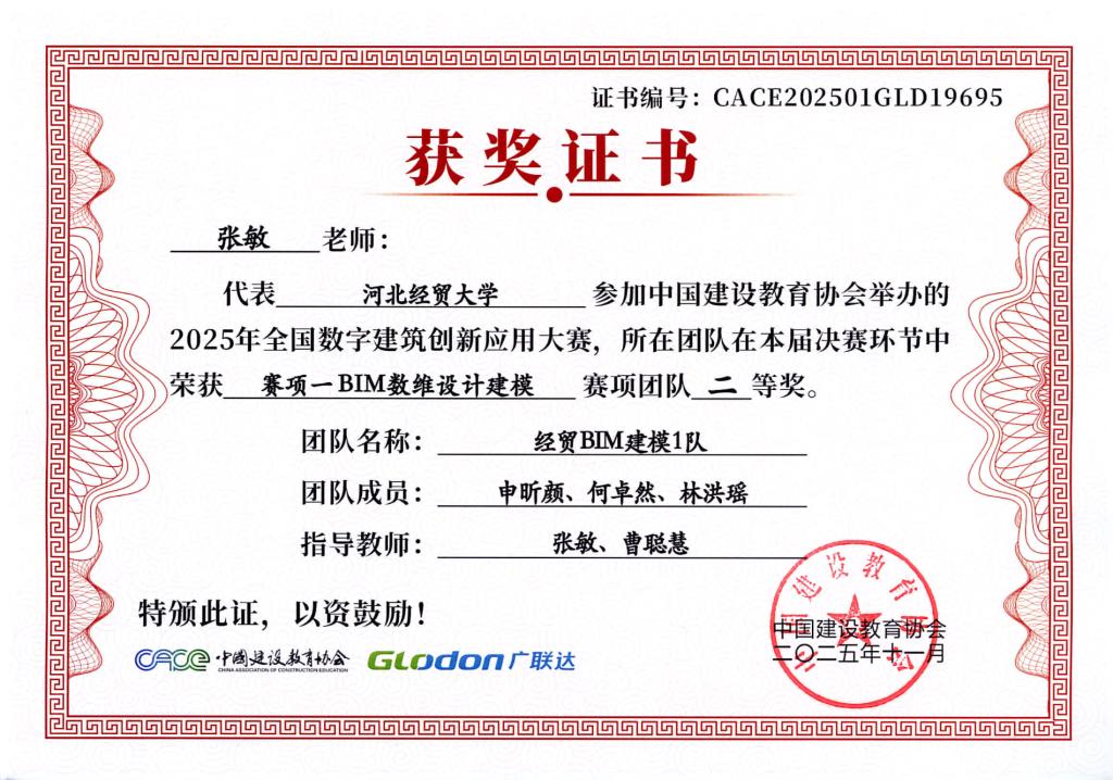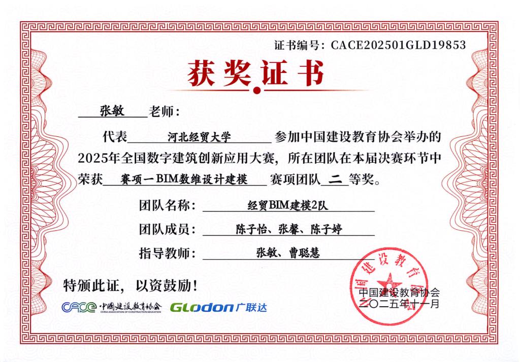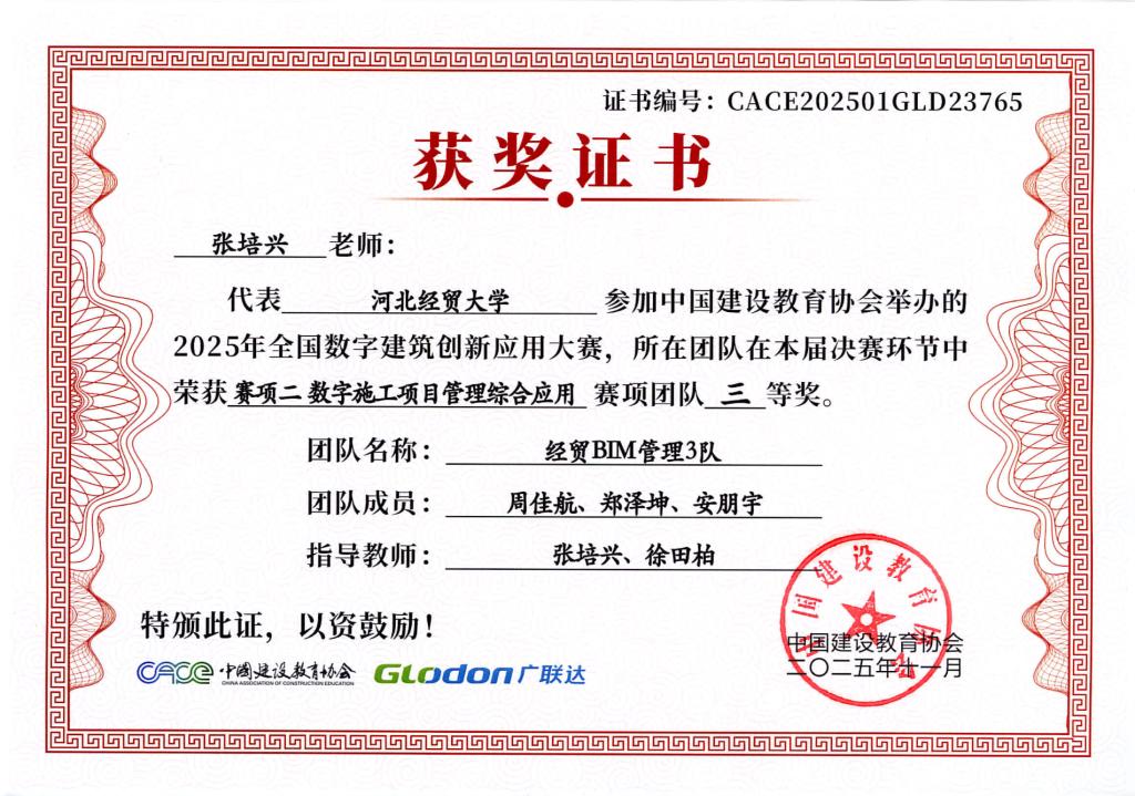 本次大赛由中国建设教育协会主办,国家数字建筑行业产教融合共同体与广联达科技股份有限公司共同协办。大赛设置了BIM数维设计建模(赛项1)、数字施工项目管理综合应用(赛项2)、建设工程计量与计价应用(赛项3)三个赛项,分为两个阶段进行,2025年9月20日举办全国选拔赛,前60%进入2025年10月18日全国总决赛。大赛自2025年4月启动,管理科学与信息工程学院工程管理系曹聪慧、张敏、张培兴、徐田柏等老师积极组织了9支队伍报名参加,经过精心的备赛,共有7支队伍突围进入总决赛,最终取得7项奖项。