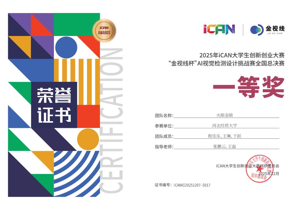 近日,2025年iCAN大学生创新创业大赛“金视线杯”AI视觉检测设计挑战赛全国总决赛圆满落幕。河北经贸大学管理科学与信息工程学院人工智能系程佳乐队和要雨涵队,在王磊、朱晓莲和张鹏云3位指导教师带领下,从全国302所院校3126名参赛者中脱颖而出,分别荣获国赛一等奖与三等奖,充分展现了我院人工智能专业的育人成果与学子的创新实践能力。